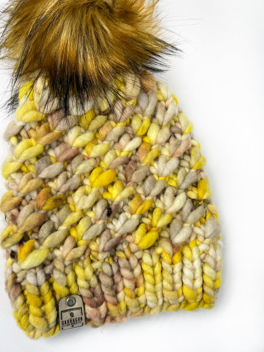 Beautifully soft 100% Hand Dyed Merino Wool knitted toque. Hand Knit in Screeched In colourway with yellow and brown